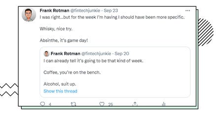 18/22: In all fairness, there were amazing events that occurred during the week that balanced out the craziness (like @remitly going public). But the environment has me shook.
