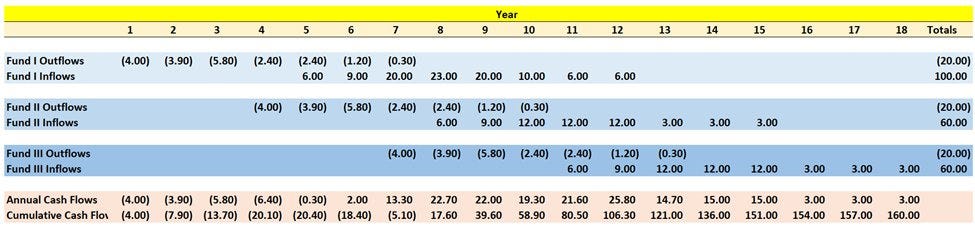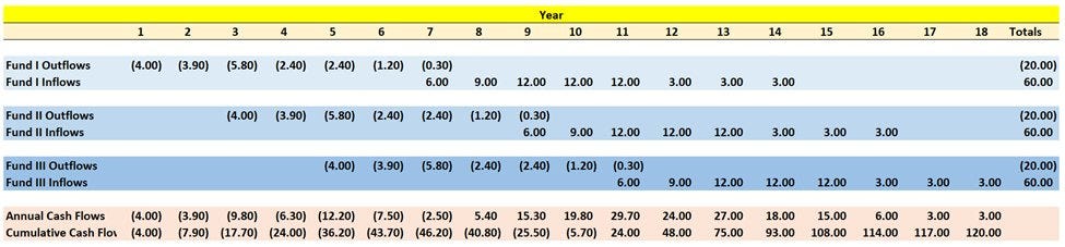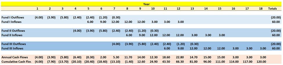 A 3-fund commitment of $20MM/fund requires a LP to commit $60MM of capital but uses only $20MM of initial cash. This example produces a 26% IRR pre-carry!