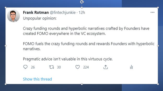 16/30: But VCs aren’t the only guilty party. Founders are fueling FOMO. Big outcomes in the public markets are driven by big ideas and Founders have reacted to this by putting plans forward that that describe massive outcomes happening at crazy speeds.